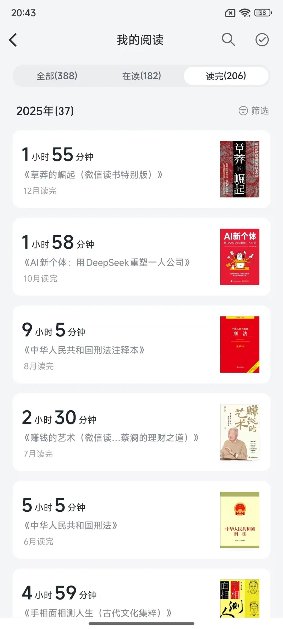 在阅读上,相比2024年,阅读量有所下降,总共阅读完37本,共计698万字,有财商,写作,法律等,如下所示