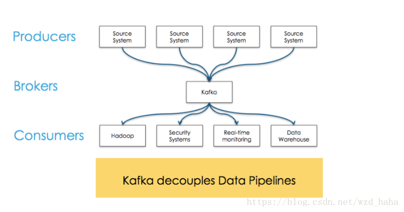 中间的brokers 是zookeeper来管理,所以安装kafka前要先安装zookeeper环境,kafka也自己继承了zookeeper ,只是一个单节点的zookeeper不是zookeeper集群,