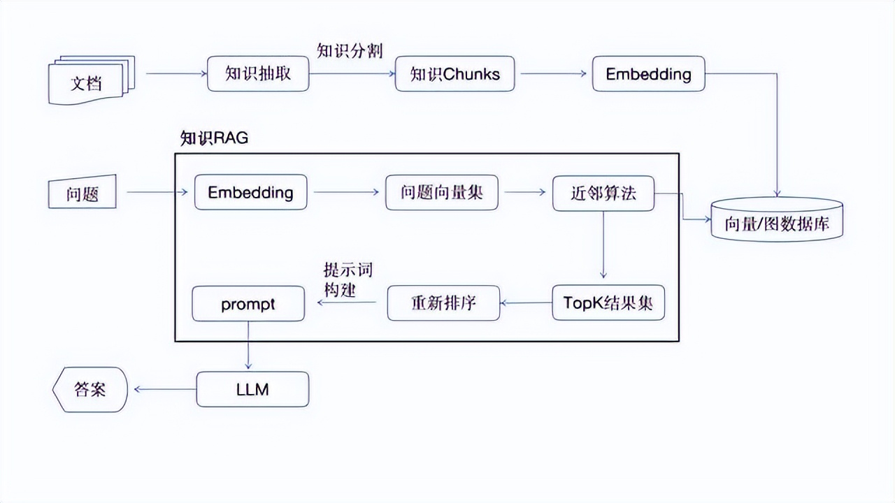 知识分块完成后,就用通过知识的嵌入模型,把知识转化为向量。向量是一组高纬度的数组,存储在专门的向量数据库或者图数据库,查询的时候问题依然会转化为向量,通过向量之间的近似算法进行匹配。