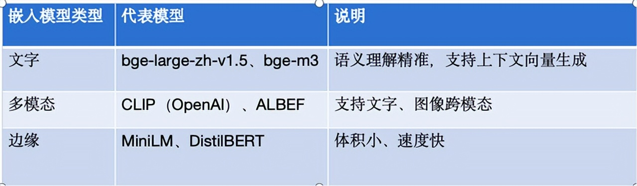 嵌入模型主要有三种类型,文字类型、图文的多模态类型、边缘类型。