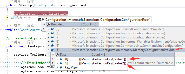 MemoryConfigurationProvider使用内存中集合作为配置键值对。若要激活内存中集合配置,请在ConfigurationBuilder的实例上调用AddInMemoryCollection扩展方法。可以使用IEnumerable<KeyValuePair<String,String>> 初始化配置提供程序。构建主机时调用ConfigureAppConfiguration以指定应用程序的配置: