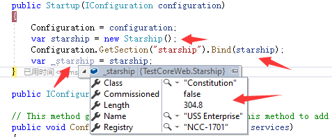 示例应用程序调用GetSection方法获取json文件中starship键。通过Bind方法把starship键属性值绑定到Starship类的实例中: