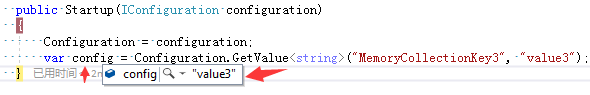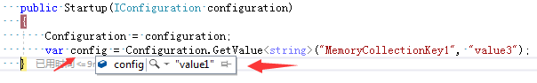 ConfigurationBinder.GetValue<T>从具有指定键的配置中提取一个值,并可以将其转换为指定类型。如果未找到该键,则获取配置默认值。如上述示例中,配置两个value1、value2值,现在我们在键MemoryCollectionKey1配置中提取对应字符串值,如果找不到配置键MemoryCollectionKey1,则默认使用value3配置值,示例代码如下: