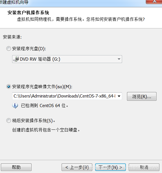 2.选择典型安装然后下一步,如下图所示找到下载好的centos7的镜像文件的存放目录,然后点击下一步。