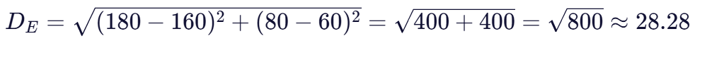 但如果我们用欧氏距离来计算,结果却会有所不同。欧氏距离的计算公式为: