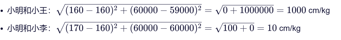 假设我们将身高和体重统一转换为厘米和克的单位,那么小明的数据为(160, 60000),小王为(160, 59000),小李为(170, 60000)。计算欧氏距离:
