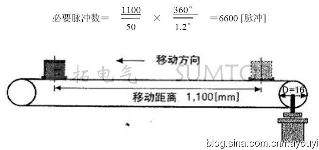 如下图,3相步进电机(1.2°/步)驱动物体运动1秒钟,则必要脉冲数和驱动脉冲速度的计算方法如下: