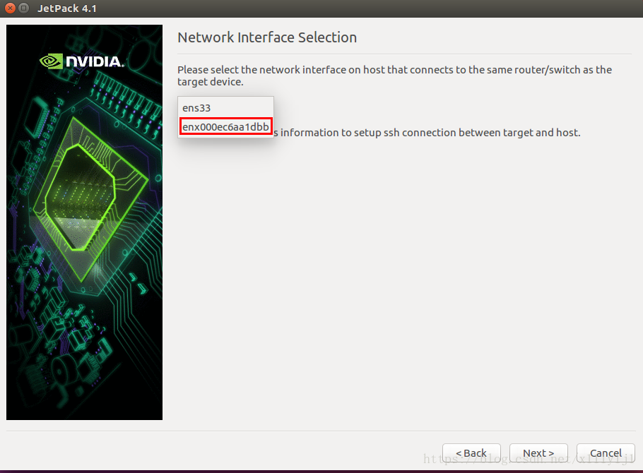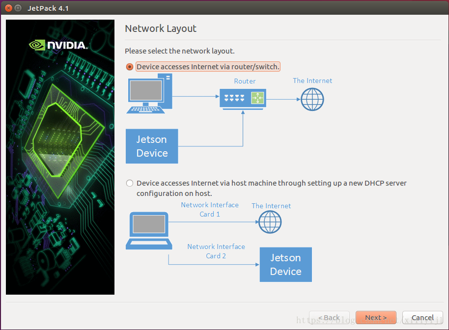 选择第一种网络连接方式,需要刷机过程中全程联网,并用网线将HOST与Jetson Device连接到同一局域网内;