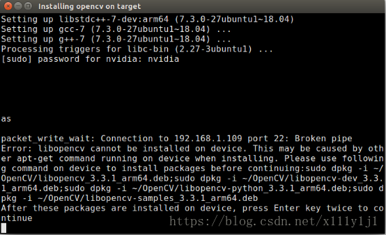 以上步骤确认无误后,在刚才的Post Installation界面中按下enter,就开始刷机了,刷机过程大约持续1~2小时,此处还有一个坑,当安装到opencv时,会提示输入密码,但是输入一次密码是无效的,必须连输几次才可生效,过程是输入nvidia-->enter-->nvidia-->enter-->nvidia-->enter反复输入4,5次才可继续安装;