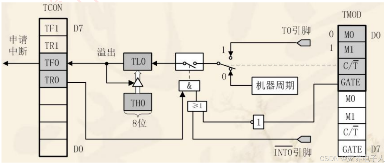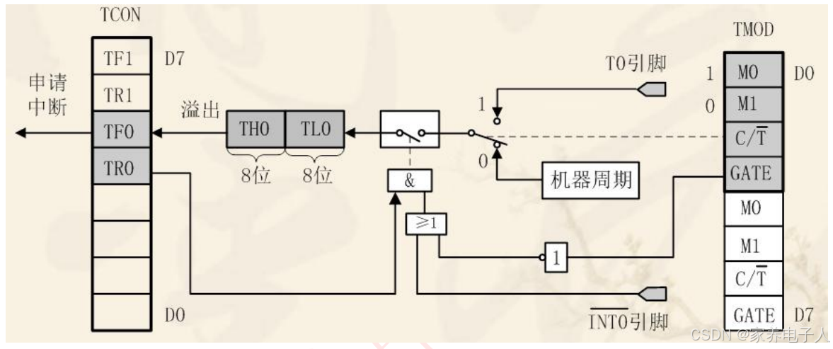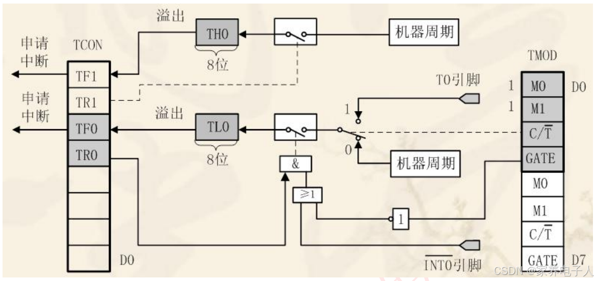 GATE:门控制位。GATE=0时,只要用软件使TCON中的TR0或TR1为1,就可以启动定时/计数器工作;GATA=1时,要用软件使TR0或TR1为1,同时外部中断引脚也为高电平时,才能启动定时/计数器工作,即此时定时器的启动多了一条件。