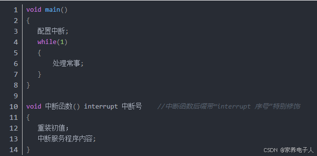 可以看出“main函数”与“中断函数”在软件上看不到任何关联,既不存在“main函数”调用“中断函数”,也不存在“中断函数”调用“main函数”的情况,在观感上,“main函数”与“中断函数”仿佛是隔离的毫无“物理连接”的,为什么单片机还能在“main函数”与“中断函数”两者中切换自如?没错,“main函数”与“中断函数”在书写上是隔离的毫无关联的,但是它们之间之所以能相互切换,是因为背后有一只无形的手在自动操控这一切,这只手就是单片机硬件自身,这是一种特殊机制,也可以理解成一种特殊的游戏规则,我们只要遵守就好了,除了普通函数,其它凡是中断函数的,都不用跟main函数发生软件上的关联调用,它们之间的切换都是硬件自动完成的,这就是main函数与中断函数的特殊跳转机制(或者称为游戏规则也可以)