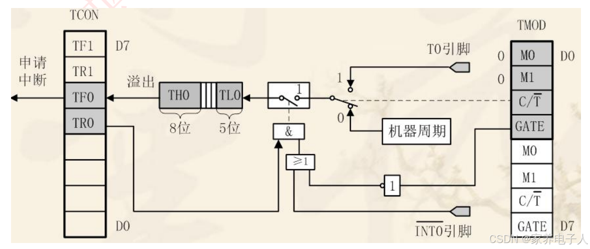 方式 0 为 13 位计数 ,由 TL0 的低 5 位 (高 3 位未用)和 TH0 的 8 位组成 。TL0 的低 5 位溢出时向 TH0 进位,TH0 溢出时,置位 TCON 中的 TF0 标志,向 CPU 发出中断请求。其结构图如下所示: