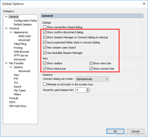 通过 SecureCRT 顶部菜单中的:“选项”—>“全局选项”