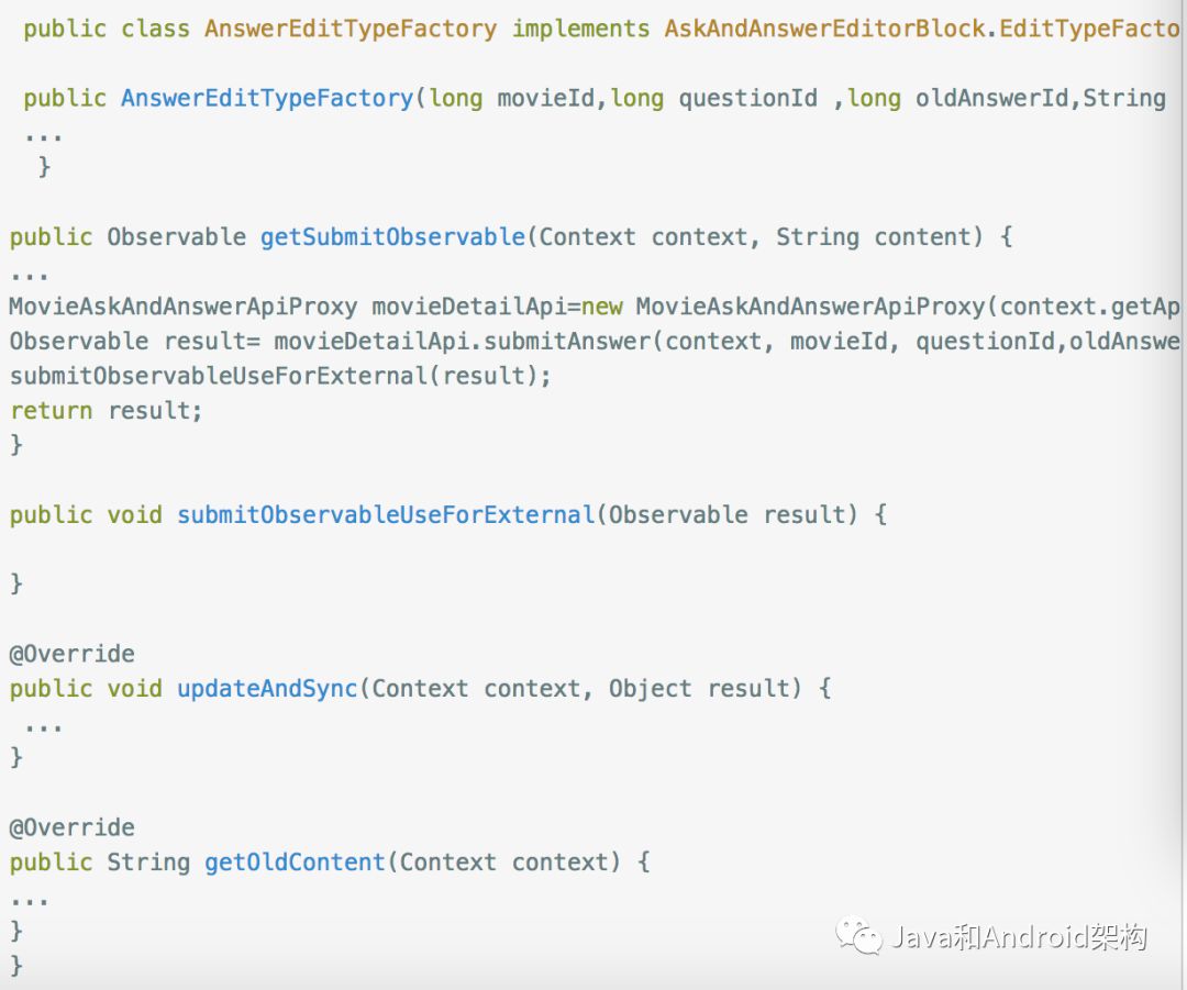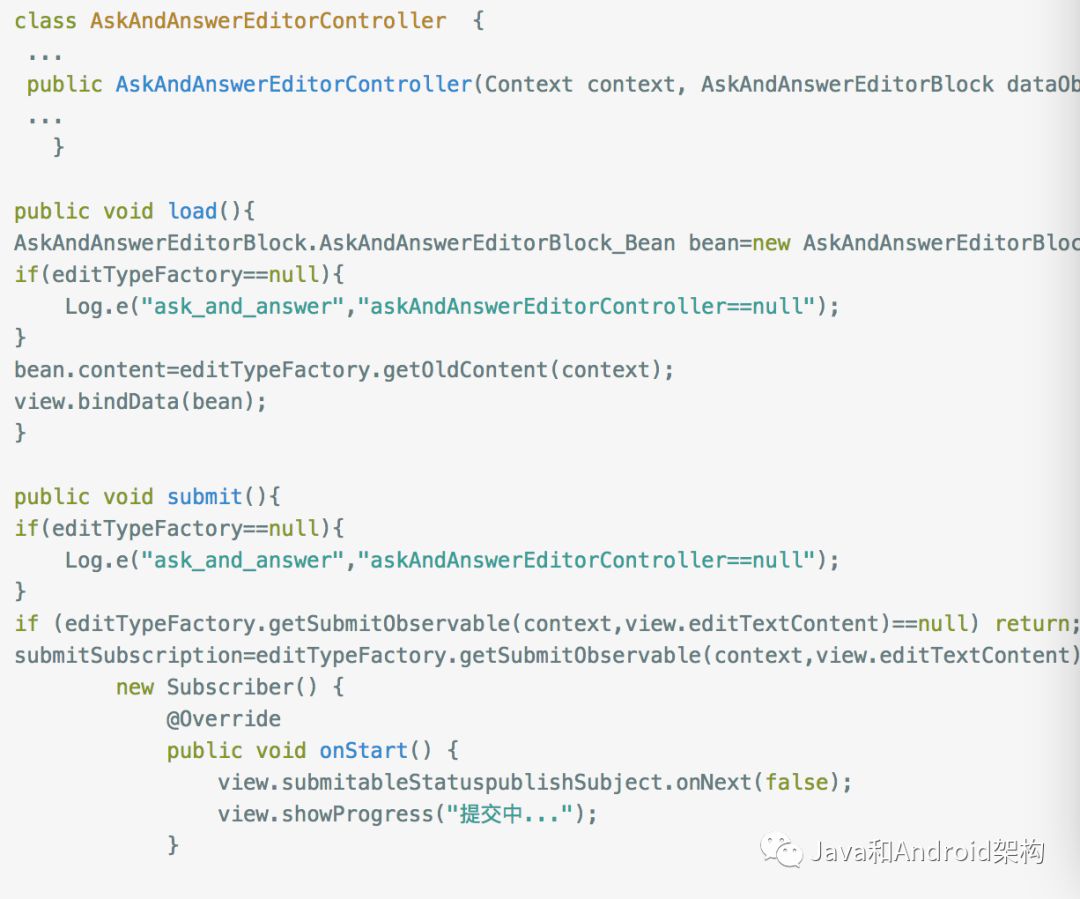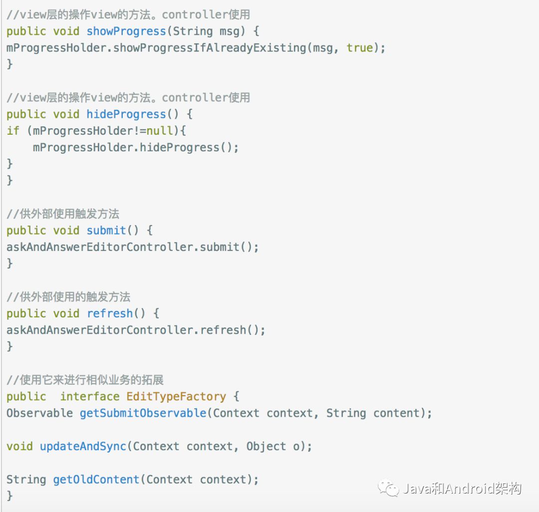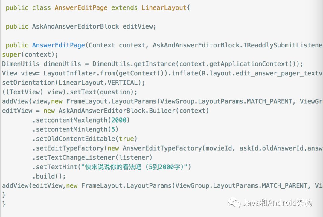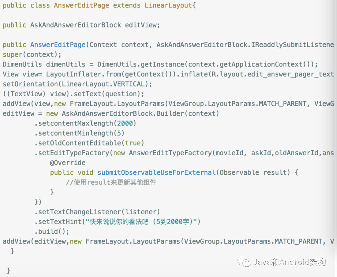 这样复用presenter大体逻辑的同时,也能进行相似业务的拓展。在上面的例子中也看到了这么一个接口。为什么要提供这么一个接口呢?因为我们在外部不需要提供presenter,而有时候又想拓展这个block的使用场景。比如我们上面这个例子,这个是一个编辑文字的组件,我们不但想让它能够编辑问题,答案,我们还想编辑点评短评。所以我们需要提供一组接口,还对不同的场景进行不同的实现,TypeFactory就是用来做这个的。那读者可能会问了,为什么不让外界提供presenter,这样岂不是更自由。是基于这么考虑的:这个AskAndAnswerEditorBlock组件的作用是提供文字编辑,然后提供,修改,还有一些提示,如果让外界提供presenter,那么不论是电影问答的presenter还是电影影评的presenter,肯定都有很大一部分的逻辑是相同的。比如: