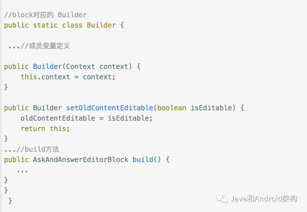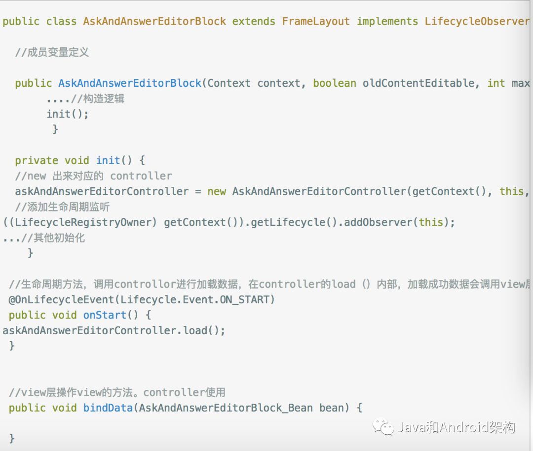 这么逻辑都是共有的。如果你让外界去提供presenter,那么他们需要写这些重复的逻辑。并且,有时候你让别人去写presenter,别人不知道你的view层是怎么写的,还得花时间读你的view层代码,还得花时间去写整个的presenter,这些都是需要很大成本的。如果只让他们提供差异性的东西,其他的不用他们管,这个组件岂不是更好用吗?build的构造方式就是这么个理念,只需要set()一些需要的东西,这个组件就构造出来就能用了。比如AskAndAnswerEditorController的使用: