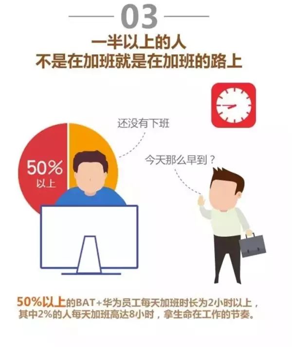 报告还显示,50% 的 BAT 华为员工,每天加班时长为 2 小时以上,其中 2% 的人每天加班高达 8 小时,拿生命在工作的节奏。而身体年龄偏老的人,每 10 个人有 8 个加班。