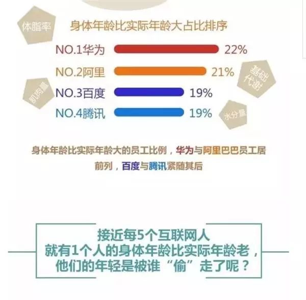 身体年龄比实际年龄大占比排序为:华为 22%、阿里 21%、百度 19%、腾讯 19%。由此来看,接近 5 个互联网人就有 1 个的身体年龄比实际年龄老。