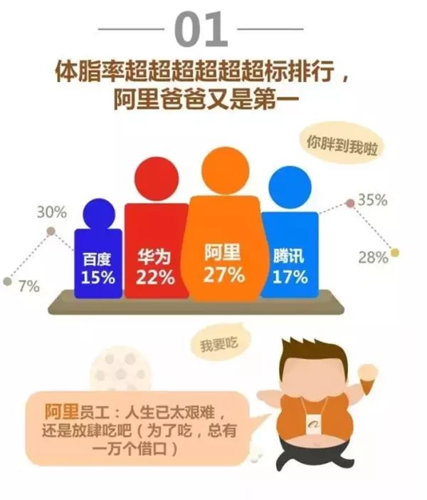 体脂率超标排行榜,阿里以 27% 再次排名第一,华为 22%,腾讯 17%,百度 15%。