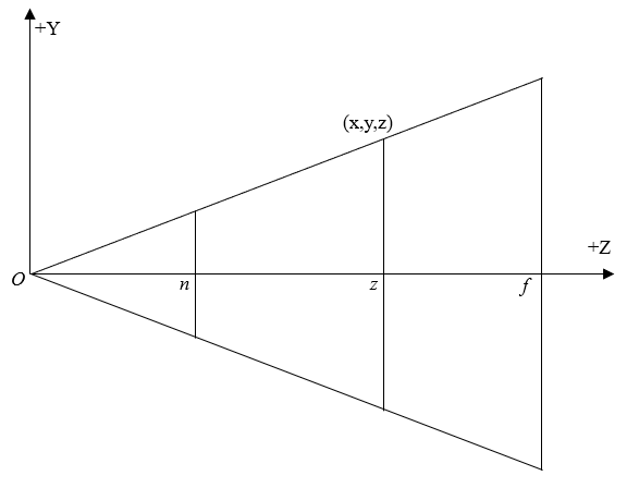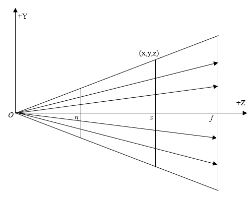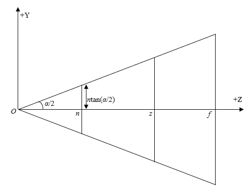 现在我们以yOz平面的视角来观察这个视锥体。在视锥体上有一点(x, y, z),由于透视投影相当于从摄像机发射出一系列射线,射线上的任意一点都会投影到屏幕的同一高度位置上,故同样高度的物体在近处显得高,在远处则显得较矮。根据相似三角形的性质,我们可以求出(x,y,z)投影到平面z=n的位置为(x’, y’, n)。其中: