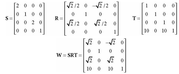\begin{bmatrix} \frac{\sqrt{2}}{2} & \frac{\sqrt{2}}{2} & 1 & 0 \end{bmatrix}\begin{bmatrix} cos45° & sin45° & 0 & 0 \\ -sin45° & cos45° & 0 & 0 \\ 0 & 0 & 1 & 0 \\ 0 & 0 & 0 & 1 \\ \end{bmatrix}=\begin{bmatrix} 0 & 1 & 1 & 0 \end{bmatrix}