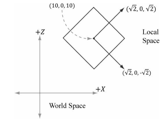 由于上面我们提到DirectX使用的是行矩阵,因此我们的基向量也为行向量。基向量是构成坐标系的包含大小的坐标轴,而3D坐标系的基是由3个基向量组成的。而3个模为1,且相互正交的基向量构成的基叫做标准正交基,其中(1,0,0), (0,1,0)和(0,0,1)则作为标准正交基的3个标准基向量