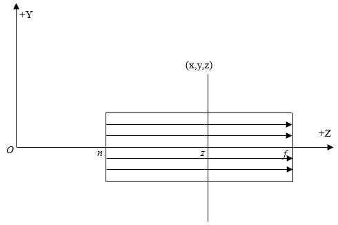 前面那个矩阵只是帮助我们将分散的射线挤压成平行的射线(前提是n > 0),但我们还没确定这个正交投影的范围。虽然用[l, r]x[b, t]x[n, f]可以得到投影矩阵,但仍然不是很方便。我们需要引入两个新的变量来间接进行描述。