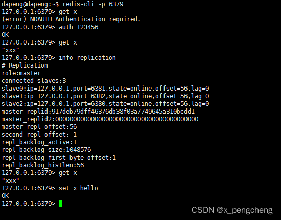 启动完成后登录主节点:查看集群状态,并设置一个key的值,验证从节点是否同步