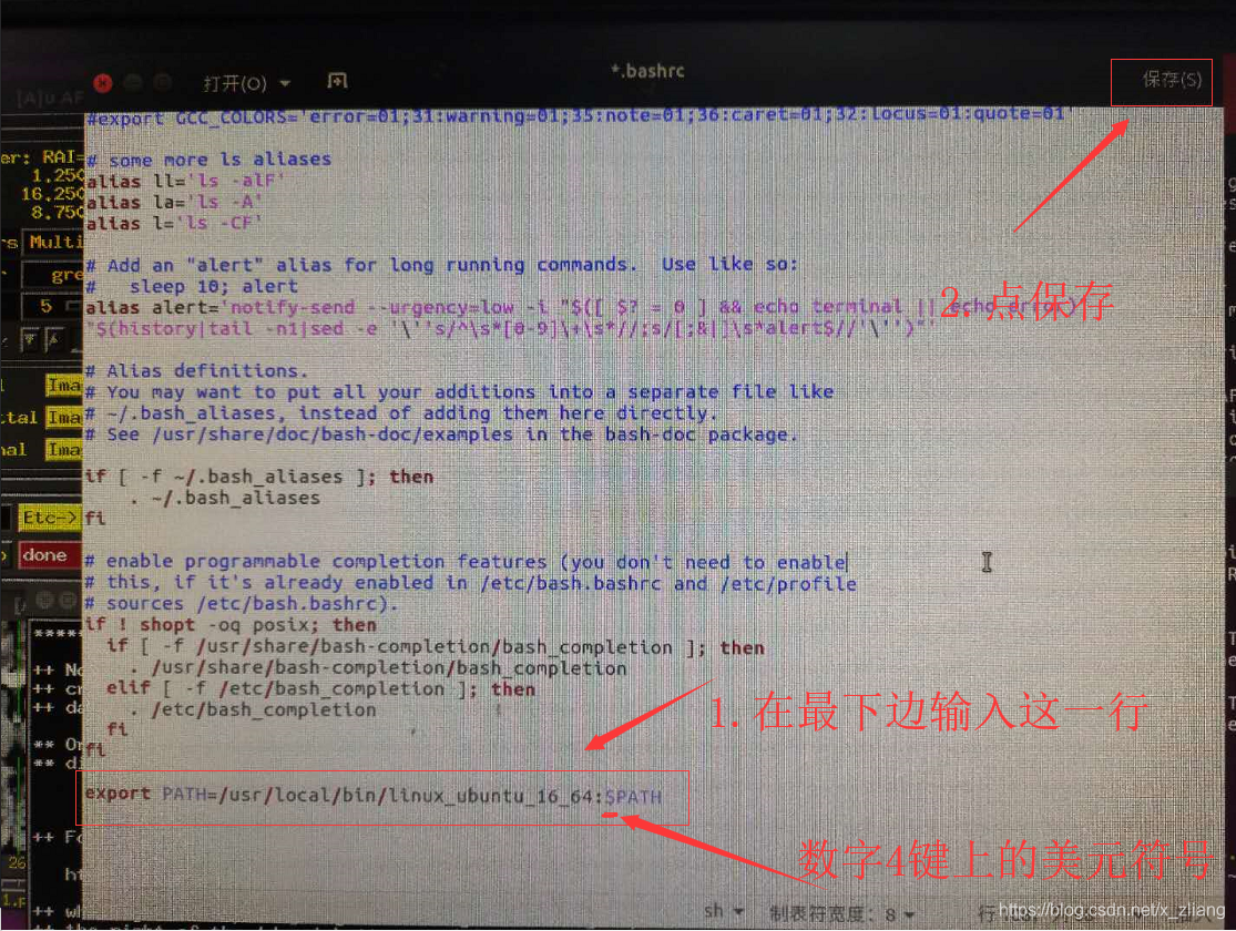 8.在*.bashrc文件的最后面输入export PATH=/usr/local/bin/linux_ubuntu_16_64:$PATH。点保存,然后关闭窗口。如下图所示