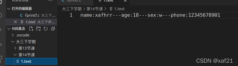 #include <stdio.h>int main(int argc, char const *argv[]){ char name[20] = "zhangsan"; int age = 18; char sex = 'w'; char phone[12] = "12345678900"; FILE *fp = fopen("./1.txt","w"); if(NULL == fp) { perror("fopen"); return -1; } fprintf(fp,"name:%s--age:%d--sex:%c--phone:%s",name,age,sex,phone); return 0;}
