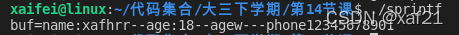#include <stdio.h>int main(int argc, char const *argv[]){ char name[20] = "zhangsan"; int age = 18; char sex = 'w'; char phone[12] = "12345678900"; char buf[123] = {0}; sprintf(buf,"name:%s--age:%d--sex:%c--phone:%s",name,age,sex,phone); printf("buf = %s\n",buf); return 0;}