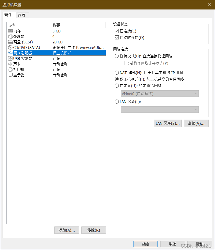 打开虚拟机设置--------->选网络适配器------->选仅主机模式
