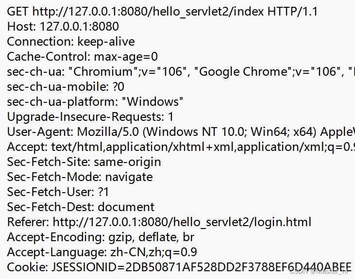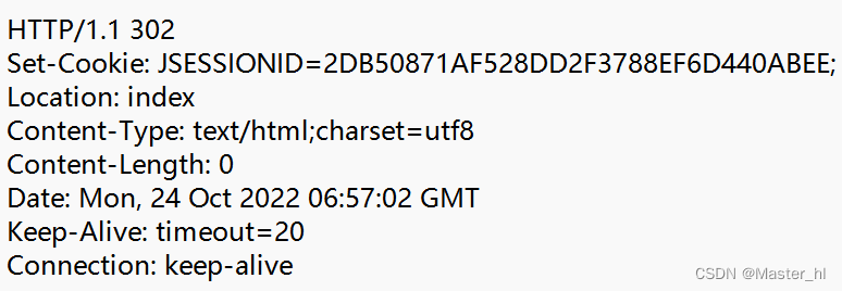 此次请求中也没有 Cookie ,但是响应报文中会带有 Set-Cookie. Set-Cookie 中 key 的名字叫做 JSESSIONID (Servlet 自动生成的), value 就是一串很长的十六进制数字, 是由服务器生成的 sessionId.