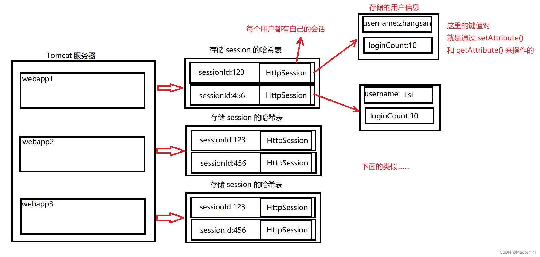 2. 用户登录后, 服务器将当前用户的信息存储在服务器端, 并生成一个 sessionId, 返回给客户端, 客户端就将这个 sessionId 存储在 Cookie 中. Cookie 里面存储的是键值对, 不能存储复杂的对象, 只能存储字符串; 并且 Cookie 是按照域名来进行分类存储的.