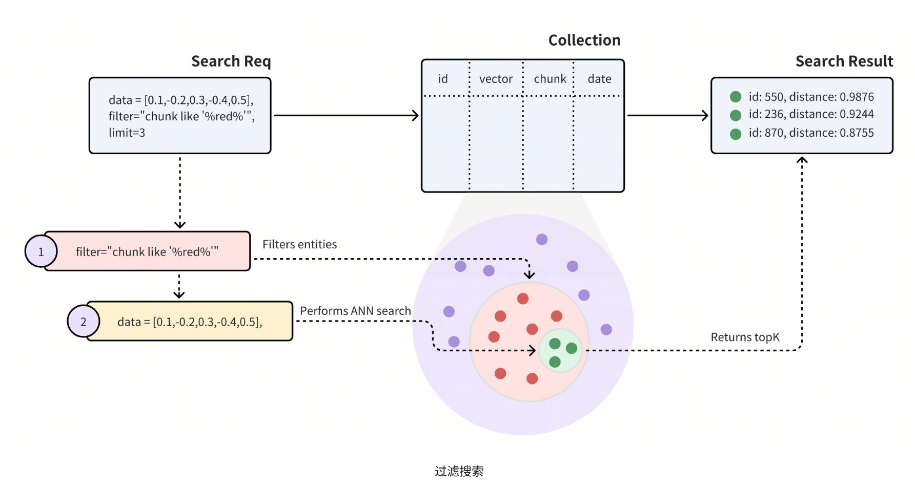 如图中所示,搜索请求中携带了过滤条件:chunk like % red %,表明应在chunk字段中包含red的所有实体进行ANN搜索。具体的过滤条件操作符可以查看具体向量数据库对应的手册。