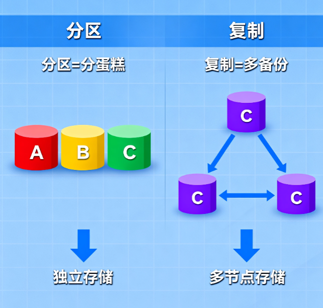 数据量太大怎么办?切!分区(Partitioning) 就是把数据集拆成独立小块,每个节点负责一块。就像图书馆按学科分区,你找《分布式系统》不用翻遍整个图书馆。