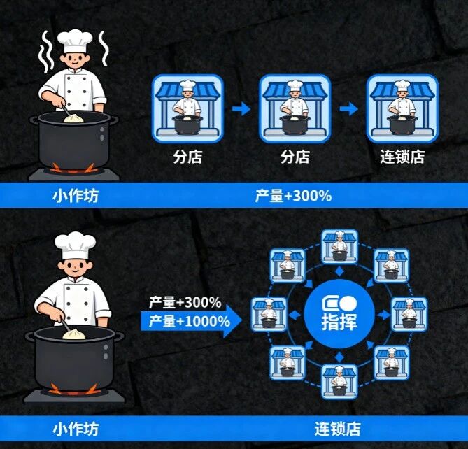 - 小作坊阶段(单机):1个师傅、1口锅,每天做100个包子,轻松愉快;
