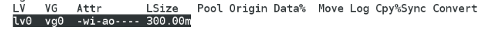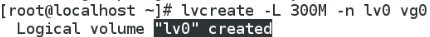 lvcreate -L 300M -n lv0 vg0 ##创建lvm ,-L指定大小,-n指定名称