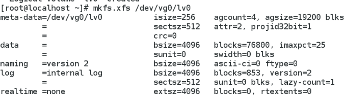 mkfs.xfs /dev/vg0/lv0 ##格式化