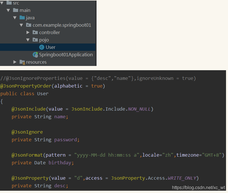 @JsonProperty:使用在某个属性上,这个注解有两个作用,第一是修改返回JSON数据的时候key值为value指定值,第二个作用是配合属性access=JsonProperty.Access.WRITE_ONLY表示属性只可以进行 序列化而不能进行反序列化,直观效果就是返回的数据没有该属性。