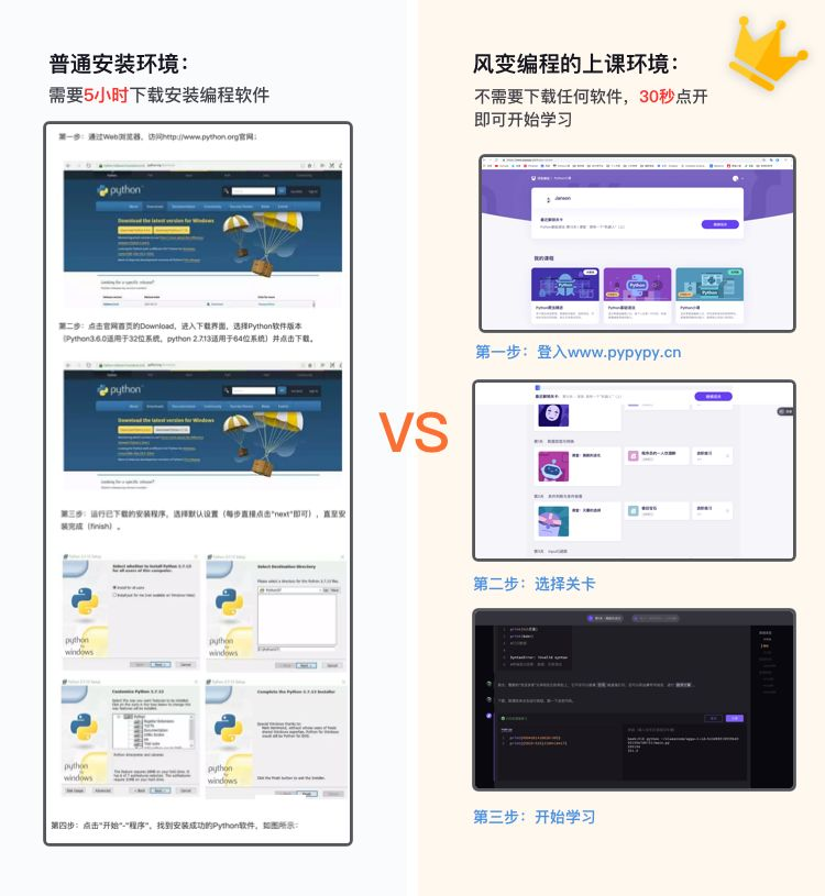 传统编程学习对于一个新手来说平均需要花5个小时安装一大堆软件和程序,花费时间还占用电脑空间。
