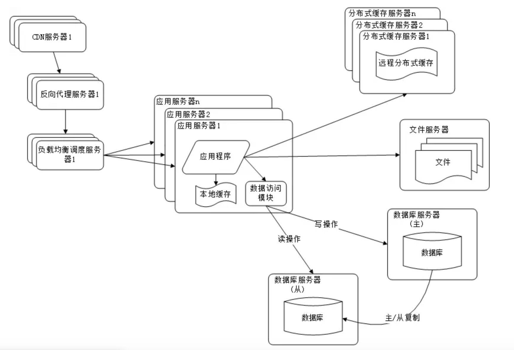 任何强大的单一服务器都满足不了大型网站持续增长的业务需求。数据库经过读写分离后,从一台服务器拆分成两台服务器,但是随着网站业务的发展依然不能满足需求,这时需要使用分布式数据库。文件系统也一样,需要使用分布式文件系统。如下图所示: