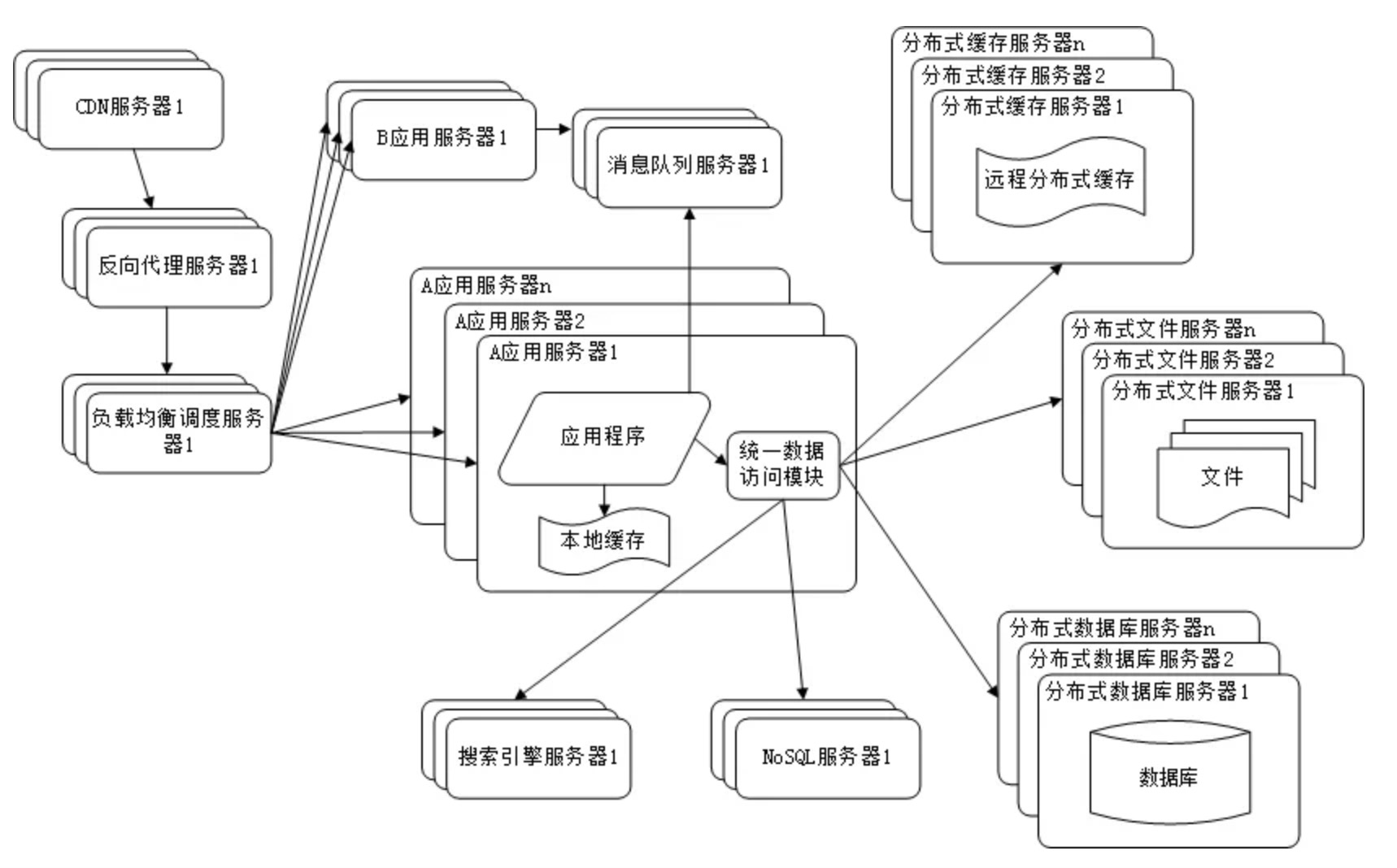 NoSQL 和搜索引擎都是源自互联网的技术手段,对可伸缩的分布式特性具有更好的支持。应用服务器则通过一个统一数据访问模块访问各种数据,减轻应用程序管理诸多数据源的麻烦。
