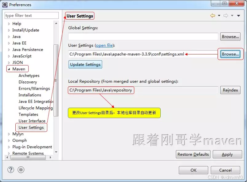 再选择User Settings目录,在User Settings中选择Browse(浏览),选择你自己maven里的conf下的settings.xml文件。
