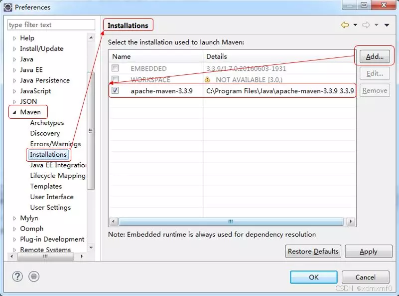选择Installations(安装),添加你自己下载并解压好的maven目录。并打上对勾 √,点击Apply(应用)