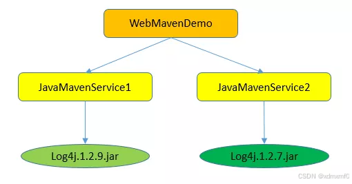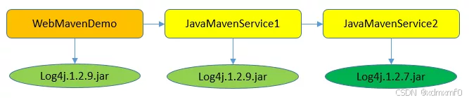 这种场景依赖关系发生了变化,WebMavenDemo项目依赖Sercive1和Service2,它俩是同一个路径,那么谁在WebMavenDemo的pom.xml中先声明的依赖就用谁的版本。