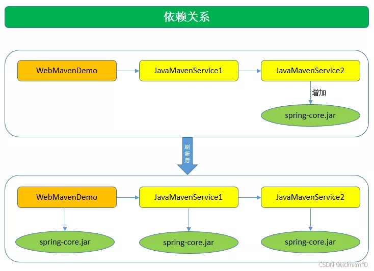 在Eclipse中,为JavaMavenService2中增加了一个spring-core.jar包后,会惊喜的发现依赖的两个项目都自动的增加了这个jar包,这就是依赖的传递性。