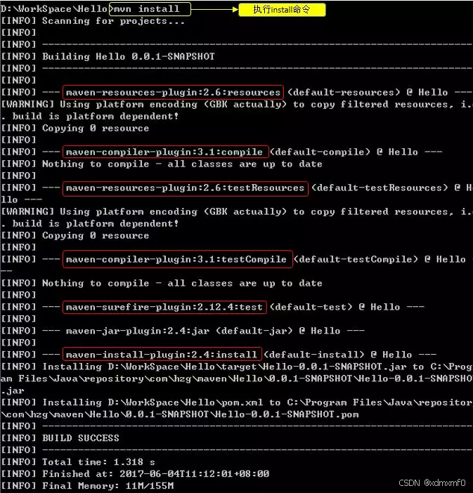 那我们在Hello的项目中执行 mvn install 命令,通过日志看看中间经历了什么?