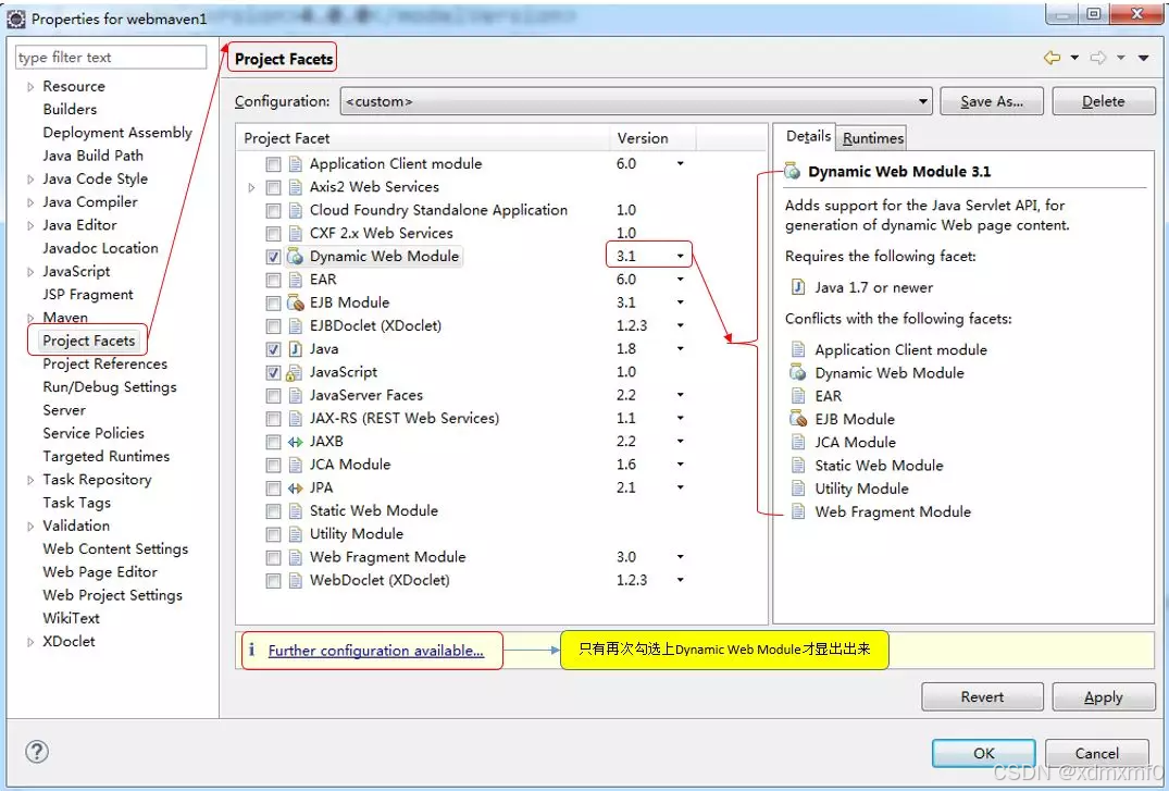 选择创建好的工程单击右键,选择properties 并找到 Project Facets,版本选择3.1,下面的java版本选择1.8,点击Apply