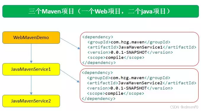 WebMavenDemo项目依赖JavaMavenService1 JavaMavenService1项目依赖JavaMavenService2