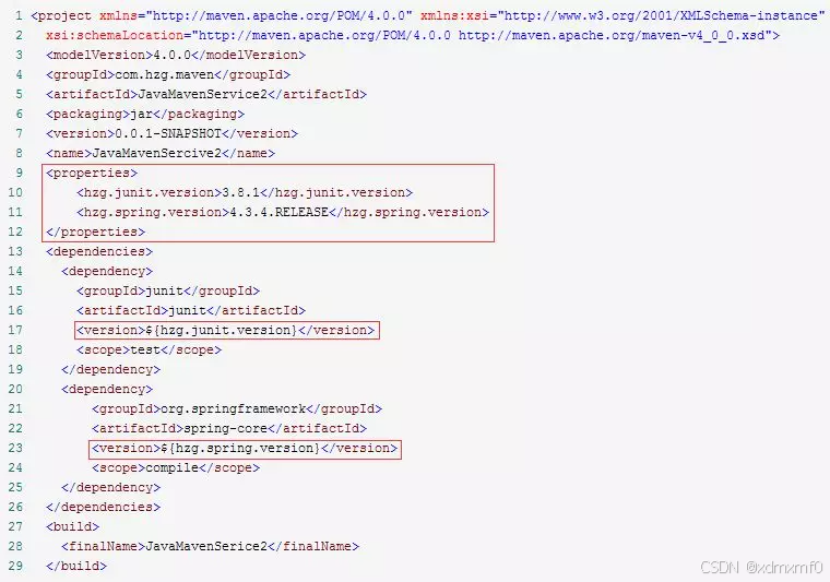为了统一管理版本号,可以使用properties标签,里面可以自定义版本的标签名。在使用的地方使用${自定义标签名}